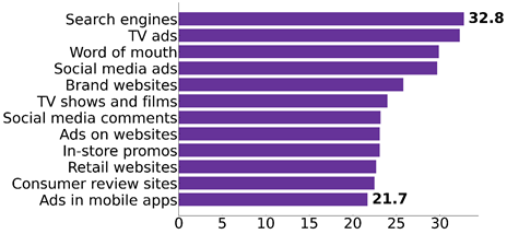 Modern multichannel marketing is built on the seamless integration of various communication channels, with mobile applications, social media, and physical retail locations playing a particularly significant role. Their effective integration enables brands to expand their audience reach and to establish personalized relationships with customers, fostering long-term loyalty. Each of these channels serves a distinct function within a marketing strategy and requires tailored approaches to maximize its effectiveness. According to report [3], search engines and TV advertisements are among the dominant sources, while digital platforms such as social media ads and mobile applications also play a major role (fig. 1).