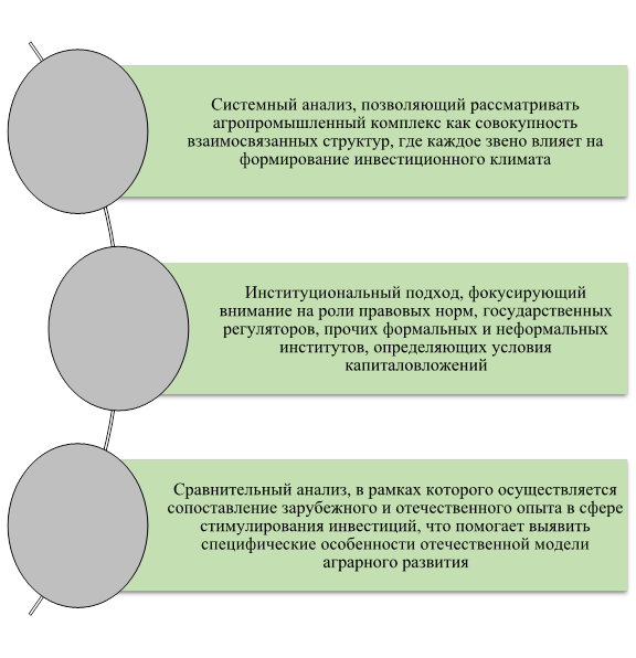 Методы, использованные при изучении темы и подготовке статьи, включают системный и сравнительный анализ, институциональный подход, оценку статистических сводок, а также обобщение. Это способствует разностороннему раскрытию проблематики и помогает выработать рекомендации для последующего совершенствования инвестиционного климата в АПК.