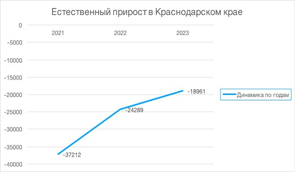 Проанализировав таблицу 2, можно сказать о том, что динамика действительно положительная. Убыль сельского населения с 2021 по 2023 год сократилась почти вдвое, а городского населения – почти на 10 тысяч. В качестве вывода можно сказать, что политика государства и местного самоуправления оказывает положительное влияние на население Кубани. Для наглядности приведем графическое изображение динамики естественного прироста в крае.
