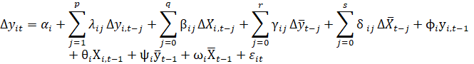 For country i over time t. It includes short-run dynamics through lagged differences (