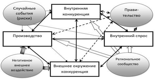 Факторы внешнего негативного влияния оказывают непосредственное воздействие на ключевые элементы кластерной динамики — такие как объёмы производства и уровень внешней конкуренции. Внутри кластера региональное сообщество выступает в роли активного участника, влияя на внутренние параметры системы: структуру спроса, производственные показатели и характер конкуренции внутри региона.