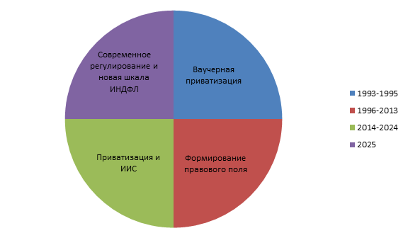В 1993 году основным инструментом были приватизационные чеки (ваучеры). Граждане могли свободно их покупать, продавать, завещать или обменивать на акции предприятий. В 1996 году вступил в силу базовый Федеральный закон «О рынке ценных бумаг» от 22 апреля 1996 года №39-ФЗ, установивший единые правила игры для всех участников. Операции стали требовать обязательной фиксации прав в реестрах или у депозитариев. В этот период (с введением НК РФ) был установлен НДФЛ на доходы от продажи акций. С 2014 года появилась льгота на долгосрочное владение (ЛДВ) для бумаг, удерживаемых более 3 лет. Появление ИИС в 2015 году стимулировало частных инвесторов проводить операции через брокеров с налоговыми вычетами. С 1 января: до 2,4 млн руб. — 13%; свыше 2,4 млн руб. — 15% (ранее порог составлял 5 млн руб.) [7, c. 113].