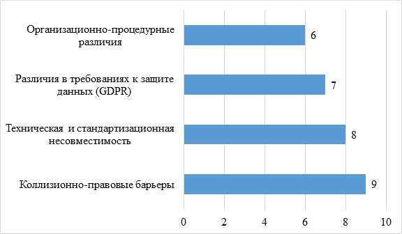Наиболее критичными экспертами воспринимаются именно коллизионно-правовые и технические барьеры, что указывает на необходимость первоочередных усилий по выстраиванию правовых рамок и технической совместимости.