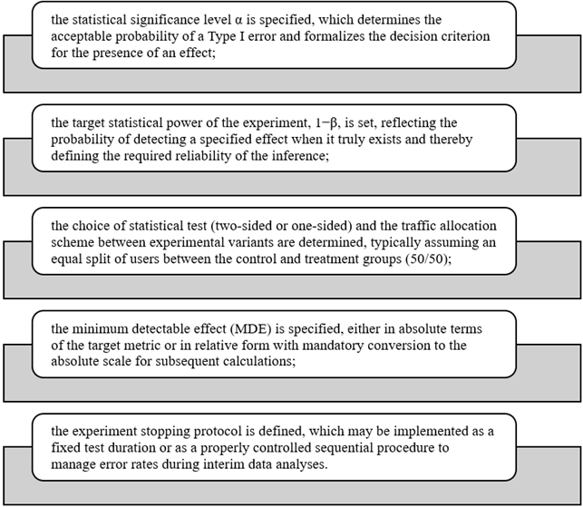 In practice, situations are frequently observed in which the experimental hypothesis is formulated, yet the minimum detectable effect (MDE) is not fixed prior to the experiment launch; the selected metric does not reflect the hypothesized mechanism of impact of the product change; and the sample size calculation is performed in isolation, without being converted into and a formalized stopping protocol. International studies on online experimentation rightly emphasize that the reliability of experimental conclusions is determined by the coherence and alignment of all stages of the experimental process [2].