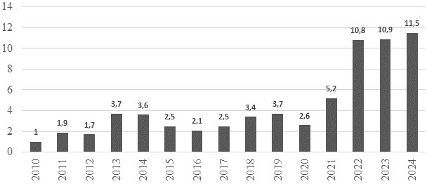 Рисунок 1. Динамика товарооборота между РФ и ОАЭ в 2010 — 2024 гг., млрд. долл. [Источник:7].