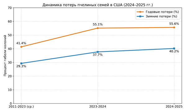 В 2025 году в современной парадигме глобального экономического развития окончательно закрепилось доминирование экологических и социальных детерминант над логикой краткосрочной прибыльности. В указанных условиях апикультура, исторически трактовавшаяся преимущественно как производство меда, приобретает характеристики значимой инфраструктурной сферы, поддерживающей устойчивость биосферы и надежность продовольственных систем. Актуальность заявленной проблематики обусловлена исключительными по масштабу стресс-факторами, проявившимися в 2024–2025 гг.: по данным национальных мониторинговых групп, потери управляемых пчелиных семей в отчетный период достигли исторического максимума 55,6%, превысив средние значения за последние 14 лет на 14,2 процентных пункта [1]. Столь резкое падение численности пчел формирует непосредственные риски для глобальной продовольственной безопасности, поскольку более 75% сельскохозяйственных культур в той или иной степени зависят от функционирования насекомых-опылителей [2].