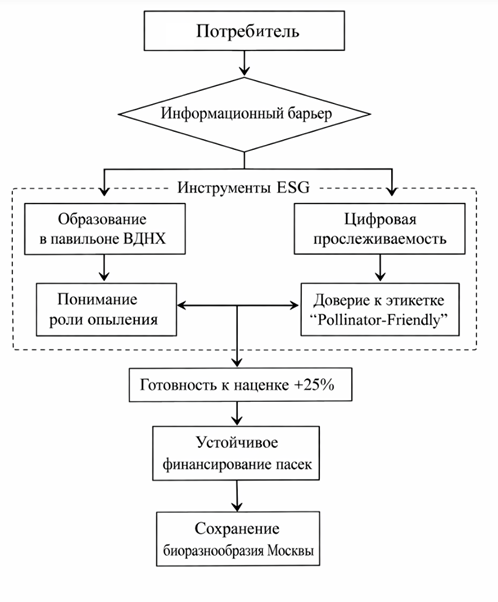 Социальное измерение ESG в сфере пчеловодства операционализируется по двум взаимодополняющим траекториям, охватывающим подготовку профессионального сообщества и системное просвещение потребительской аудитории. В 2025 году под руководством автора был завершен проект масштабной реконструкции павильона №28 «Пчеловодство» на ВДНХ, в результате чего объект был преобразован из экспозиционно-музейного формата в научно-образовательный центр, институционально связывающий интересы государственных структур, бизнеса и общества [4]. Действующая экспозиция «Жужжащий мир» интегрирует технологии дополненной (AR) и виртуальной (VR) реальности для иммерсивной визуализации биологии пчелиной семьи и логики функционирования колонии как сложной суперорганизменной системы. Ключевым компонентом стала первая в России публичная энтомологическая лаборатория, в рамках которой организованы занятия, посвященные качеству апипродукции, что напрямую соотносится с зафиксированным потребительским запросом: по данным 2025 года 67% российских потребителей декларируют готовность переплачивать за органические продукты, однако демонстрируют выраженный дефицит доверия вследствие недостатка прозрачной и понятной информации о методах производства [12]. Авторская модель взаимодействия в структуре образовательной инфраструктуры представлена на рисунке 2 ниже.