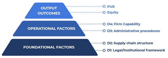 D1 (Legal/Institutional framwork) captures the domestic framework implementing EVFTA origin obligations: the clarity and consistency of Circular 11/2020/TT–BCT (Vietnam's transposing regulation), C/O issuance system efficiency, and availability of self–certification (REX). D2 (Supply chain structure) captures macro–level compatibility between a sector's input–sourcing geography and applicable RoO – operationalising Cadot et al.'s (2006) structural barrier concept at the sector level. D3 (Administrative procedures) captures practical C/O certification efficiency, costs, and SME accessibility. D4 (Firm capability) captures firm–level RoO knowledge, compliance expertise, financial resources, and crucially – control over input sourcing decisions, which the CMT production model forecloses.