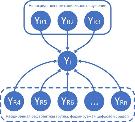 Референтная группа, на которую ориентируется потребитель может формироваться как по профессиональному, так и по возрастному, культурному или территориальному признакам [4], [5]. При этом, в доцифровой экономике пространство социального сравнения было относительно локализованным: индивид сопоставлял своё положение преимущественно с ограниченным кругом лиц, находящихся в сходных с ним социально-экономических условиях. Это означало, что относительный компонент функции субъективного благополучия был ограничен структурой непосредственного социального окружения.