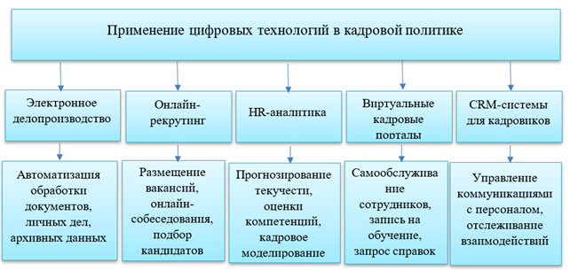Важнейшим направлением развития кадровой политики является внедрение цифровых HR-технологий. Применение данных технологий воспроизведены на рисунке 2 [4, с.49].