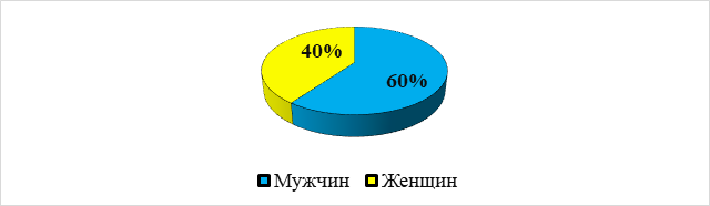 Таким образом, средняя разница в возрасте между мужчинами и женщинами составила 3,25 года (таблица 1). Из общего числа пациентов (n=65) мужчины составили 39 (60%), женщины – 26 (40%) (рисунок 1).