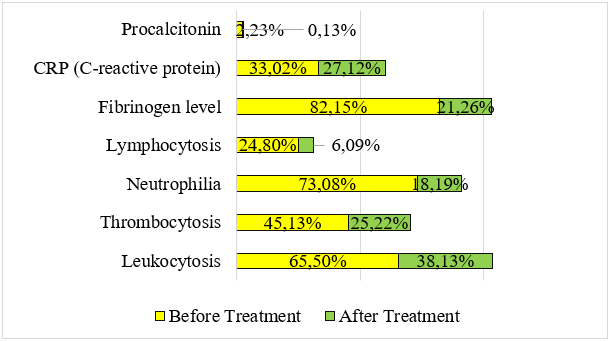 Furthermore, by monitoring the indicators of the general blood test before and after antibacterial treatment, we observed certain differences. It was found that there was a significant decrease in the following parameters: leukocytosis before treatment was 65.5%, and after treatment, it decreased to 38.13%; thrombocytosis was 45.13% before treatment and 25.22% after treatment; neutrophilia decreased from 73.08% to 18.19%, lymphocytosis from 24.8% to 6.09%, fibrinogen level decreased from 82.15% to 21.26%, CRP decreased from 33.02% to 27.12%, and procalcitonin dropped from 2.23% to 0.13%. A notable observation is that after antibacterial treatment, leukocytosis decreased by 58.21%, neutrophilia decreased by 75.11%, and fibrinogen decreased by 74.12%, while CRP decreased in only 21.75% of cases (Figure 4).