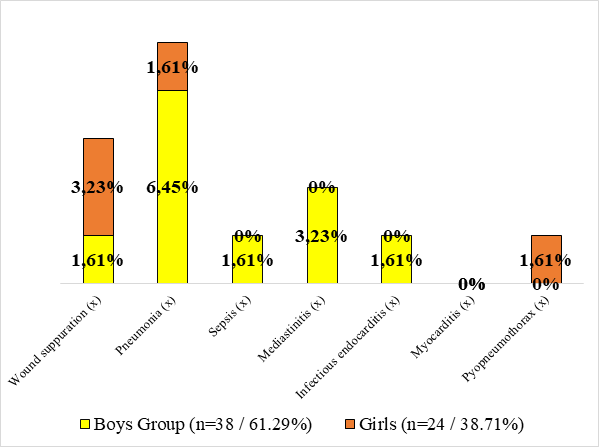 Из 62 детей в группе n=13 (20,96%) были выявлены осложнения, основными из которых стали: развитие пневмонии после операции — n=5 (8,06%), гнойное воспаление раны — n=4 (6,45%), медиастинит — n=2 (3,23%), сепсис и инфекционный эндокардит, пиопневмоторакс — n=3 (4,84%). Наибольшее количество случаев было связано с микроорганизмами: Staphylococcus aureus — 14,51%, Staphylococcus epidermidis — 12,9%, Klebsiella spp. и Pseudomonas aeruginosa — 11,3%, Candida — 8,1%, Escherichia coli и другие инфекции — 6,45%. Карбапенемы и гликопептиды показали наивысшую эффективность (соответственно до 92% и 90%).