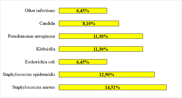 Taking into account the frequency of development of infectious complications, an analysis was conducted on the bacteriological studies monitoring the growth of microflora (Figure 2). Clinically significant microflora growth (Candida, Klebsiella, Acinetobacter, Enterococcus, Staphylococcus, etc.) was found in n=13 patients, including: Staphylococcus aureus - 14.51%, Staphylococcus epidermidis - 12.9%, Klebsiella spp. and Pseudomonas aeruginosa - 11.3%, Candida - 8.1%, Escherichia coli and other infections - 6.45% (Figure 2).
