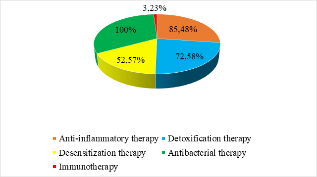 All children admitted to the hospital were provided with all types of conservative therapy in accordance with the treatment protocols, and treatment was prescribed. Anti-inflammatory therapy was administered to 85.48%, detoxification therapy to 72.58%, desensitization therapy to 52.57%, and antibacterial therapy to 100% of the children (p<0.01). Additionally, immunotherapy replacement drugs were prescribed to n=2 (3.23%) children in severe condition (Figure 3).