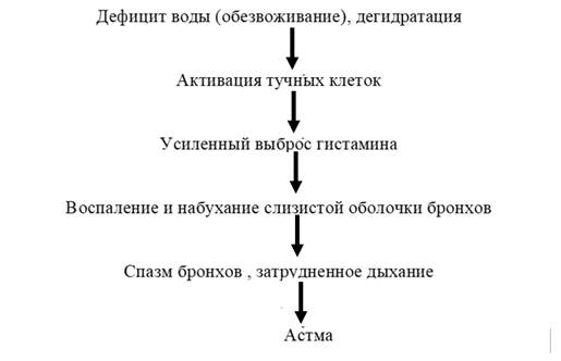 В результате патентно-информационного поиска глубиной 50 лет при ознакомлении доступного нам огромного количества научного материала нас заинтересовала экспериментальная работа Goldstein Daniel J. and Halprin J.A. В 1977 году, 47 лет тому назад, в английском журнале «Nature” была опубликована статья этих авторов, где они доказывают, что причиной бронхиальной астмы является локальная дегидратация в области бронхов. Также авторы описали механизм спазмов, возникающих при астме, где огромная роль принадлежит гистамину. В норме, это биологически активное вещество регулирует в том числе и уровень воды в организме. Гистамин является продуктом тучных клеток, которые располагаются по ходу мелких кровеносных сосудов, окутывающих бронхи. Если концентрированная кровь достигает легких, происходит локальная выработка гистамина — это естественный и автоматический процесс, однако его избыточное высвобождение вызывает воспаление слизистой оболочки бронхов, тем самым сужая их просвет порождает приступ астмы [8, 250].