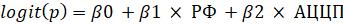 где P - вероятность осложнения, β0 – константа, β1 – коэффициент для РФ, β2 – коэффициент для АЦЦП. Для определения коэффициентов регрессии было использовано компьютерное программное обеспечение, Minitab (Minitab 19.1.1.0).