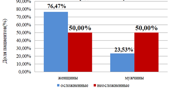 Изучение гендерного состава среди обследованных пациентов показал, что осложнения чаще были выявлены среди лиц женского пола и соответствовали абсолютным\относительным значениям:76,47% женщин (13) против 23,53% мужчин (4) в основной группе, 50% (7)женщин против 50% мужчин (7) в контрольной группе, распределение пола в группе пациентов без осложнений одинакова (рисунок 1). Для оценки различий был применён χ2-тест, c помощью которого, было рассчитано значение p, что составило 0,126. Это дает нам основание сделать вывод о том, что статистически значимой разницы между группами нет. Связи пола и наличия осложнений не выявлено.
