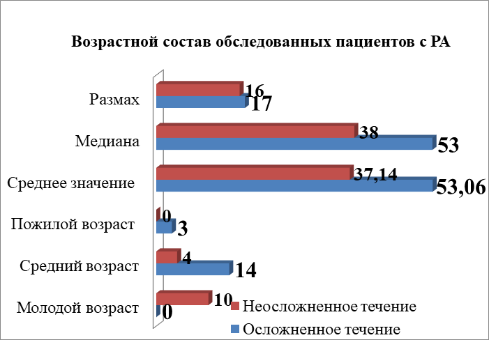 Полученные результаты нашего исследования позволяют оценить значимость предикторов риска в развитии ревматоидного артрита среди больных. Было установлено, что осложненное течение чаще наблюдается у пациентов среднего возраста, при этом значимости пола с развитием осложненного РА выявлено не было. Также было выявлено то, что продолжительность заболевания является одним из предикторов риска развития осложнений. При этом, более длительное течение болезни увеличивает вероятность развития осложнений, чаще в виде деформации и анкилоза суставов.