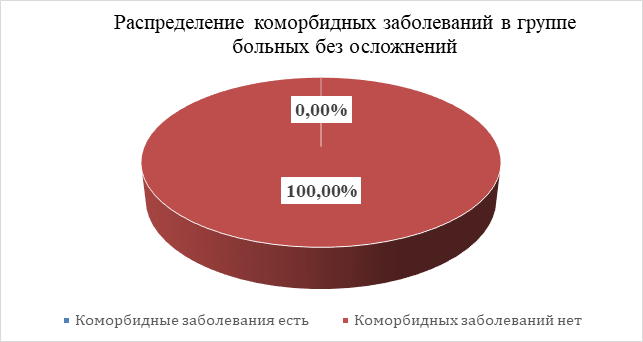 Изучение распространенности коморбидных заболеваний среди обследованных пациентов показал, что у 76,47% (13) из 100% (17) I основной группы пациентов с осложнениями есть сопутствующие заболевания, тогда как среди больных без осложнений (II группы) они не выявлены (рисунок 4, рисунок 5). χ2-тест показал высокую статистическую значимость различий (p < 0,001). Пациенты с сопутствующими заболеваниями имеют более высокий риск развития осложненного артрита. Ведущими сопутствующими заболеваниями среди пациентов основной группы были: среди 100% (13 пациентов) с осложнениями, 61,5% (8) пациентов имели верифицированный диагноз артериальная гипертензия, 23% (3) сахарный диабет 2 типа, 15,5% (2) пациента имели бронхиальную астму.