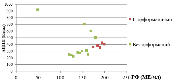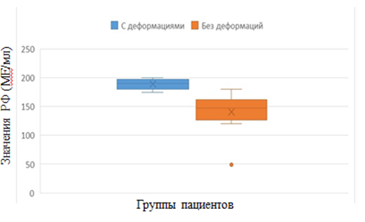 На рисунке 8 нами представлены значения РФ у пациентов с осложнениями в виде деформаций. Согласно рис. 7 у пациентов с деформациями медиана РФ составляет 190 МЕ/мл, а у пациентов без деформаций — 152,5 МЕ/мл. Разброс значений у пациентов без деформаций больше (от 49 до 180 МЕ/мл), чем у пациентов с деформациями (от 175 до 200 МЕ/мл), подчёркивая связь РФ с деформациями.