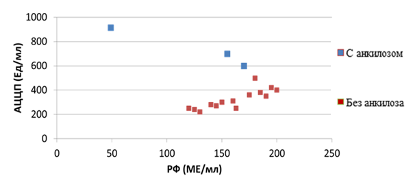 Как показано на рисунке 9 пациенты с анкилозом имеют более высокие значения АЦЦП (600–915 Ед/мл), чем пациенты без анкилоза ( 220–600 Ед/мл). С помощью логистической регрессии, используя формулы, были получены данные РФ: p ≈ 0,45, АЦЦП: p ≈ 0,012 Результат для маркера РФ: 𝑝≈0,45>0,05 → РФ не имеет связи с анкилозом. Для АЦЦП: p≈0,012<0,05 , что указывает на значимую связь АЦЦП с формированием анкилоза суставов. Данные значения дают нам основания указать на важность АЦЦП для прогнозирования развития анкилоза у пациентов с РА.