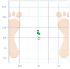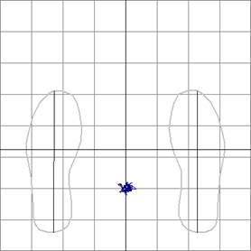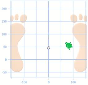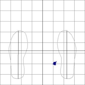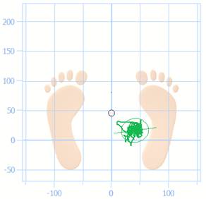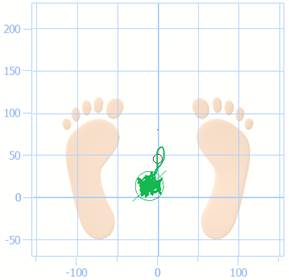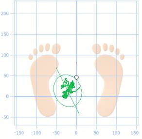 Пациент Д., возраст 14 лет. Диагноз: Левосторонний нижний монопарез, как следствие полинейропатии. Работа проводилась в 2008 году на виброплатформе Galileo в 2 позициях: 1. И.п. стоя вертикально. 2. И.п. лежа – только нижние конечности на платформе в положении пассивной стойки. Амплитуда работы проводилась в диапазоне от 8,0 Гц до 14,0 Гц. Из первичного осмотра: В основной стойке – подгибание левого коленного сустава 270 с приведением колена внутрь. Опущение левой половины таза. Постурологическое компьютерное исследование (Рис. 5, табл. 1): Выраженное тяжелое компенсаторное смещение центра тяжести во фронтальной плоскости «Х (мм)» с опорой на правую (здоровую) нижнюю конечность (НК).