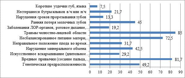 Результаты исследования показали, что уровень информированности родителей о ЗЧА является недостаточным. Всего 46,7% родителей правильно определили, что такое зубочелюстные аномалии. Немногим больше (49,2 %) смогли перечислить основные факторы риска развития ЗЧА. При этом чаще всего упоминались травмы челюстнолицевой области (85%) и вредные привычки (сосание пальца, соски)- 81,7%. Заболевания ЛОР-органов отметили лишь 19,2% респондентов, нарушение сроков прорезывания и смены зубов -13,3%, о наличие коротких уздечек губ или языка в качестве отягощающего критерия знали только 7,5% (рис.1).