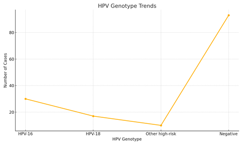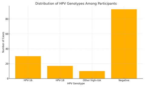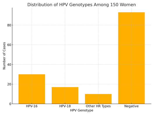 Among the 150 women screened, 57 (38%) tested positive for at least one high-risk HPV genotype. HPV-16 was detected in 30 cases (20%), HPV-18 in 17 cases (11.3%), and other high-risk types in 10 cases (6.7%). 93 women (62%) tested negative. The chart below shows the distribution of HPV genotypes.