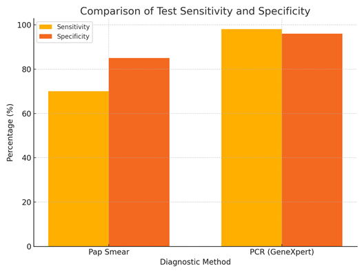 PCR testing demonstrated: Sensitivity: 98%, Specificity: 96%. By contrast, Pap smear results showed: Sensitivity: ~70%, Specificity: ~85%