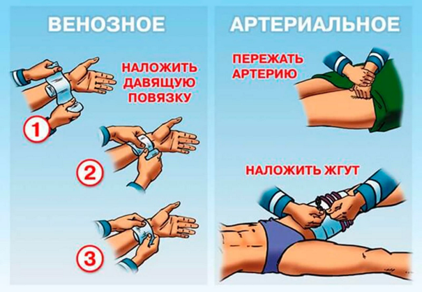 Рисунок 4. Оказание первой помощи при венозном и артериальном кровотечении