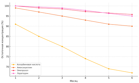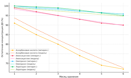 Корреляционный анализ Пирсона выявил сильную отрицательную зависимость между временем хранения и концентрацией действующего вещества у аскорбиновой кислоты (r = –0,96) и амоксициллина (r = –0,89), что свидетельствует о регулярной экспоненциальной деградации. У омепразола (r = –0,61) и лоратадина (r = –0,55) связи умеренными, что отражает большую стабильность молекул.