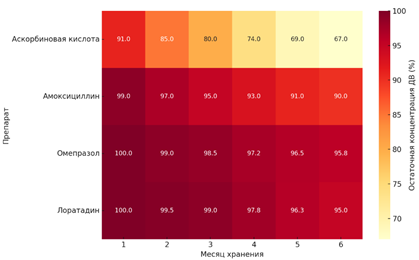 Для наглядного представления результатов построена тепловая карта остаточной концентрации действующего вещества, отражающая динамику потерь в зависимости от условий и длительности хранения (рис. 7). Визуализация, выполненная на основе данных таблиц 4 и 5 с использованием программного обеспечения OriginPro, позволила быстро выделить наиболее чувствительные к внешним воздействиям препараты, а также идентифицировать критические режимы хранения, при которых наблюдается интенсивная деградация.