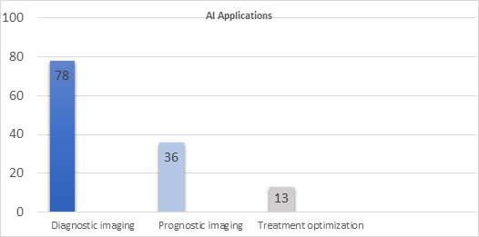 A second major area of application was prognostic modeling, explored in 36 studies. These algorithms aimed to predict clinical outcomes such as survival, treatment response, and toxicity risk. Survival models reported concordance indices ranging from 0.72 to 0.85, and AI tools for treatment response often achieved odds ratios greater than 2.0 compared to standard risk assessments. Several studies focused on predicting toxicity risk with high discrimination, achieving AUCs above 0.80.