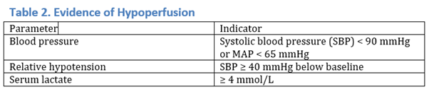 Check for tissue hypoperfusion symptoms [Table 4]: