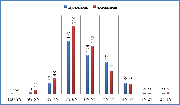 На втором месте по численности оказалась группа в возрасте 55-65 лет. Анализ по половому составу показал, что женщины преобладали в большинстве групп. (рис.1)