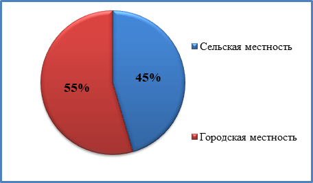 Согласно собранным данным, количество пациентов с диагнозом полипоз толстого кишечника, составляет 456 человек (45 %), проживающих в сельской местности и 547 человек (55 %) - в городах (рис.2).