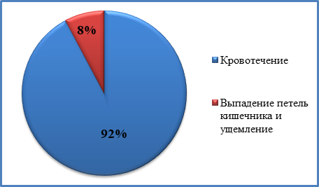 Для 180 пациентов потребовалась срочная госпитализация, вызванная острыми симптомами, такими как боль в животе или ректальное кровотечение, связанных с полипами [4, с.129]. Из числа экстренно поступивших пациентов, 166 (92%) поступили по причине кровотечения, 14 пациентов (8%) - выпадение петель кишечника и их ущемление (рис. 3).
