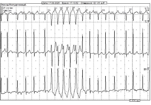 Рисунок 1. Фибрилляция предсердий, тахисистолия. Пробежка мономорфной желудочковой тахикардии