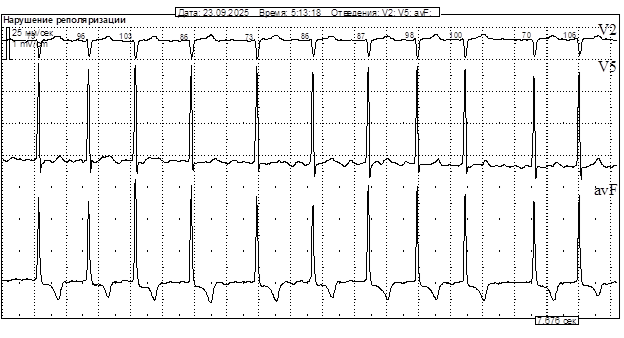 При объективном осмотре на момент поступления: нормального питания (ИМТ=20.7 кг/м2). Кожный покров и видимые слизистые – бледно-серые. Периферических отеков нет. Одышка при наклоне туловища вперед. Конечности прохладные на ощупь. Доступные пальпации лимфоузлы не увеличены, безболезненны. Перкуторно над легкими коробочный звук. Дыхание жёсткое, сухие свистящие и жужжащие хрипы с двух сторон в большом количестве, удлинение выдоха, ЧД=20 в минуту. Левая граница относительной тупости сердца расширена + 1.5 см влево, остальные в пределах нормы. Тоны сердца приглушены, ритм неправильный, ЧСС= 90 ударов в минуту АД = 130/100 мм рт. ст.. Насыщение крови кислородом на атмосферном воздухе 98%. Живот мягкий, безболезненный. Печень у края реберной дуги, 12-11-9 см по Курлову. Симптом поколачивания отрицателен с обеих сторон. Симптомов тиреотоксикоза нет. Электрокардиография при поступлении: Фибрилляция предсердий, тахисистолия с частотой желудочковых сокращений 92-151 ударов в минуту (средняя 121). Отклонение электрической оси сердца влево. Нарушение реполяризации по нижней стенке левого желудочка. Назначена терапия: калий-магний-натриевая смесь внутривенно капельно, раствор Преднизолона 60 мг внутривенно струйно утром, 30 мг – в обед, Т. Ривароксабан 20 мг внутрь 1 раз в сутки, Т. Верапамил 40 мг внутрь 3 раза в сутки, Капс. Омепразол 20 мг за 30 минут до завтрака, Т. Аторвастатин 40 мг вечером, Т. Спиронолактон 25 мг утром, до еды.