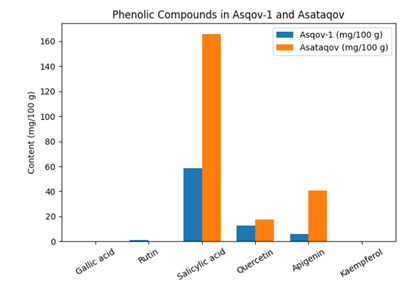 The diagram presents the quantitative content of several phenolic compounds in the food supplements Asqov-1 and Asataqov, expressed in mg per 100 g of product. Phenolic compounds are known for their strong antioxidant properties and their role in neutralizing free radicals in biological systems.