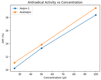 The illustration illustrates how the concentration of tested extracts is associated with the antiradical activity (ARF%). To the best of our knowledge, the antiradical activity of compounds (Asqov-1 and Asataqov) is higher when used in larger quantities. The antiradical activity is a minimum of 10.2% for Asqov-1 as well as 11.0% for Asataqov at 25 µL. With an increased concentration of 50 µL, activity was significantly increased, with Asqov-1 (13.3%) and Asataqov (13.8%) showing markedly increased activity. At 100 µL the highest antiradical activity was observed for both samples at the highest tested concentration. The activity of Asqov-1 was about 18.3%, and Asataqov was higher at 19.4%. The present data suggests that both supplements are capable of overcoming the free radicals, and the antioxidant activity increases with concentration. Asataqov also showed slightly greater antiradical activity as compared to Asqov-1 at each concentration tested suggesting an improved antioxidant functionality. This potentially is probably due to the higher levels of phenolic compounds found in Asataqov supplementation for improved activity [8; 1905].