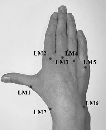 Полученные фотографии подвергались стандартизации, включавшей приведение к единому пространственному разрешению (960х1280 пикселей), что являлось необходимым условием для последующего морфометрического анализа, а также каждой фотографии необходимо было присвоить уникальное название, которое бы позволило расположить каждого участника в определенном порядке и дать фотографии уникальную характеристика, например «dMf003» (d – правое, «dexter»; M – кисть, «manus»; f – женский пол, «femina»; 003 – порядковый номер участника). Далее помещенные в отдельную папку фотографии (фотографии правых кистей – в одну папку, левых кистей – в другую) с помощью программы tpsUtil32 и команды «Build tps file from images» фотографиям, находящимся в каждой из каждой из папок присваивались координаты их расположения в памяти компьютера. Сформированные в tpsUtil32 tps-файлы далее открывались с помощью программы tpsDig264. На каждом изображении последовательно наносились метки (landmarks, LM), соответствующие основным легко идентифицируемым анатомическим точкам кисти, где LM1 – головка I пястной кости, LM2 – головка II пястной кости, LM3 – головка III пястной кости, LM4 - головка IV пястной кости, LM5 – головка V пястной кости, LM6 – processus styloidei ulnae, LM7 – processus styloidei radii (рисунок 1).