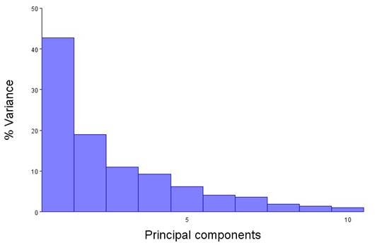Рисунок 2. Распределение дисперсии в аспекте анализа главных компонент (PCA) от PC1 до PC10