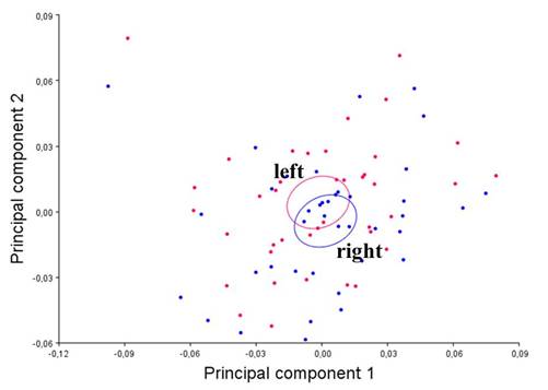 Рисунок 3. Доверительные эллипсы для средних значений (отдельные эллипсы для правой и левой сторон всех наблюдений, каждый эллипс включает в себя область, в которой с 95% вероятностью может находиться среднее значение каждой из групп «право-лево»/ «right-left»)