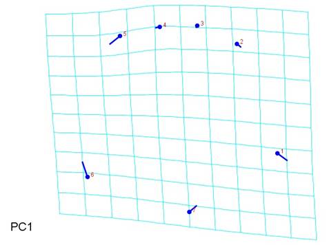 Рисунок 4. Визуализация сдвига векторов изменчивости для каждой из ландмарок в аспекте первой главной компоненты (PC1) на трансформационной решетке