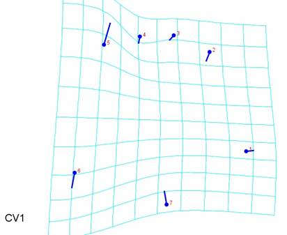 Рисунок 6. Графическая визуализация изменчивости формы, ассоциированной с CV1, на трансформационной решетке