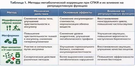 Основные методы метаболической коррекции и их влияние на репродуктивную функцию представлены в таблице 1.
