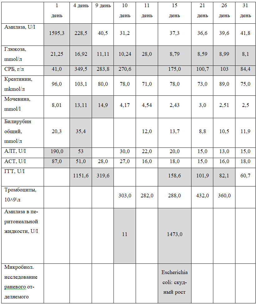 Острую фазу панкреатита подтверждало 15-кратное повышение амилазы в первый день госпитализации. На фоне проводимой терапии показатель нормализовался к 9 дню. Обращает на себя внимание исходная гипергликемия – 21,25 mmol/л, что свидетельствует о вовлечении островкового аппарата, вырабатывающего инсулин, в деструктивный процесс. Назначение инсулинотерапии способствовало снижению уровня глюкозы крови к 15 дню. СРБ – маркер системного воспаления, отражающий масштаб поражения и разрушения поджелудочной железы, продемонстрировал классическую динамику: исходно повышенный уровень (41 г/л) резко вырос к 4 суткам, что свидетельствовало о высокой вероятности инфекционных осложнений и указывало на необходимость смены схемы лечения. В дальнейшем, на фоне санации очага, отмечено постепенное снижение СРБ до 84,4 г/л.