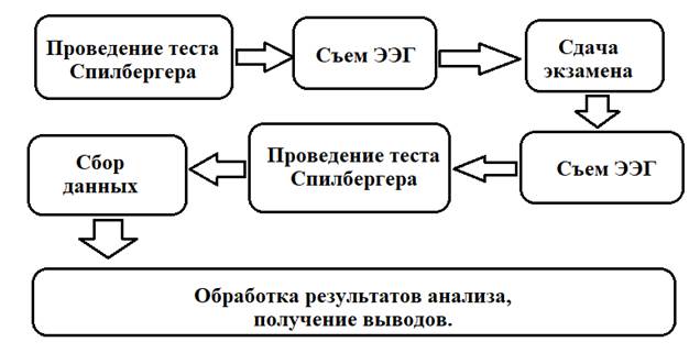 - Набор добровольцев (студентов), согласившихся принять участие в эксперименте. От каждого участника было получено письменное информированное согласие на прохождение тестирования, регистрацию электроэнцефалограммы (ЭЭГ), а также на обработку персональных и полученных в ходе исследования данных. Проведение исследования одобрено этическим комитетом.